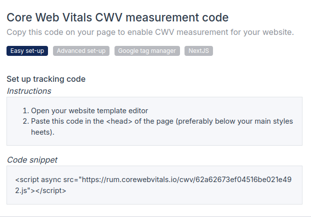 Deploy the generated tracking code to your website. Copy the snippet and paste it into the <head> of your HTML. We use the async attribute to ensure the script never blocks your page load keeping your site fast while we measure it.